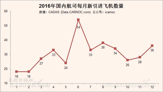 2016全年共引進飛機369架,其中12月份新引進飛機36架,6月份引進數(shù)量最多,達到54架。