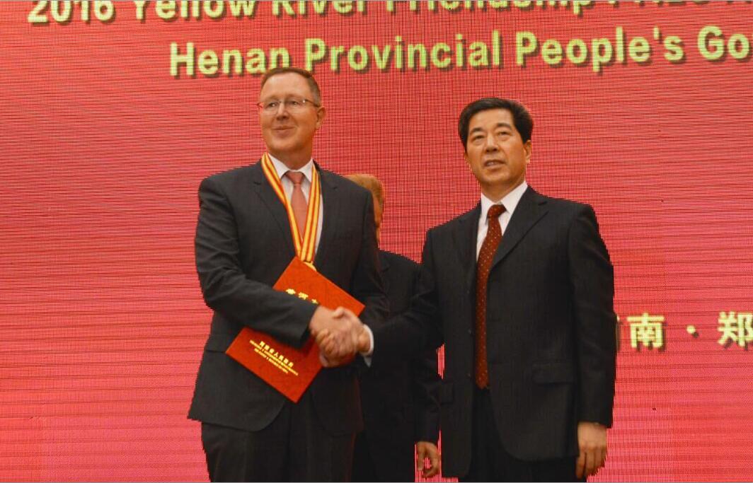 On 29th, September, Henan Provincial Government held a grand reception to celebrate the 67thanniversary of the founding of the People's Republic of China. Deputy Party Secretary of the CPC Henan ProvincialCommittee, Governor of Henan Province, Mr. Chen Runer attended the reception and awarded 8 foreigners including former CargoluxPresident & CEO and consultant of HNCA, Dirk ReichYellow River Friendship Prize for 2016.