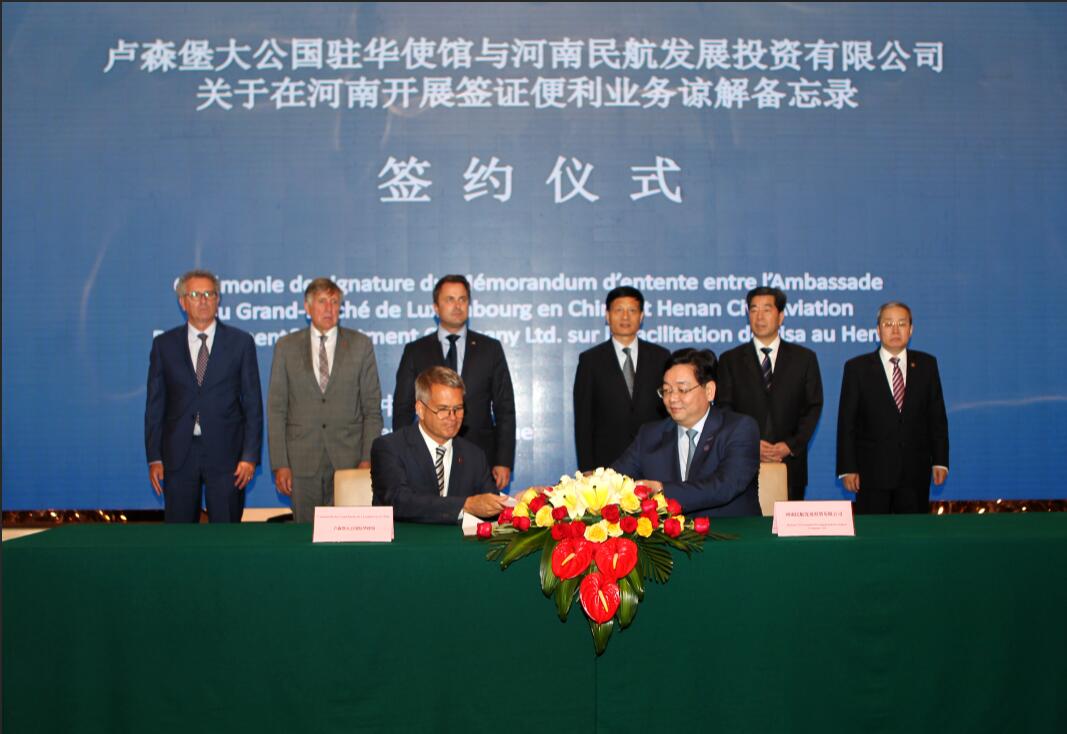 6月13日,省委書(shū)記、省人大常委會(huì)主任謝伏瞻在鄭州會(huì)見(jiàn)了來(lái)豫訪問(wèn)的盧森堡首相格扎維埃?貝泰爾一行,并和省長(zhǎng)陳潤(rùn)兒共同見(jiàn)證有關(guān)合作協(xié)議的簽署。河南航投黨委書(shū)記、董事長(zhǎng)張明超一同參加會(huì)見(jiàn),并代表河南航投與盧森堡駐華大使石泰嵋簽署《關(guān)于在河南開(kāi)展簽證便利業(yè)務(wù)諒解備忘錄》.