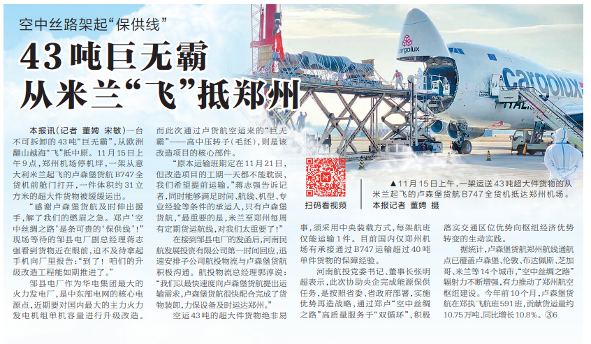 本報訊(記者 董娉 宋敏)一臺不可拆卸的43噸“巨無霸”,從歐洲翻山越海“飛”抵中原。11月15日上午9點,鄭州機場停機坪,一架從意大利米蘭起飛的盧森堡貨航B747全貨機前艙門打開,一件體積約31立方米的超大件貨物被緩緩運出。